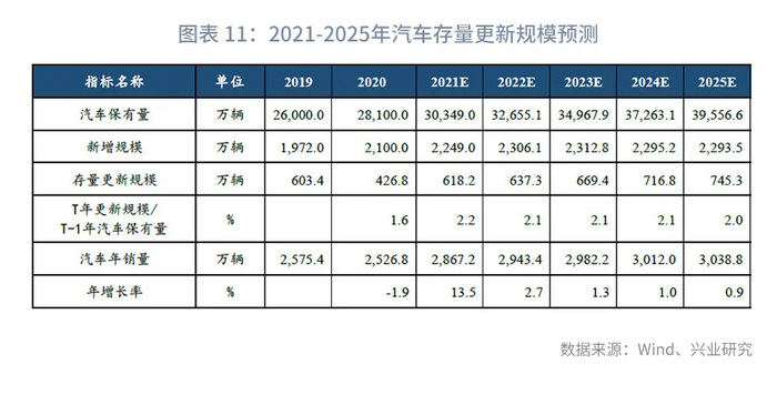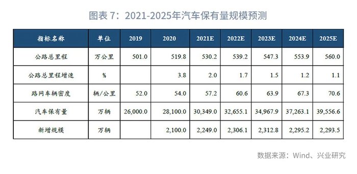 在上述假设下,计算可知,2025年我国汽车保有量的总规模预计将达到3.96亿辆,较2020年的2.81亿辆增长1.15亿辆,由此,2021-2025年间年平均增长率约为7.1%,年平均增长2291万辆。