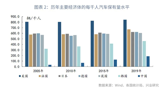 从每千人汽车保有量的水平来看,我国当前仍然处于较低水平。2019年我国每千人汽车保有量仅为186辆,同期美国每千人汽车保有量达到了842辆。法国、德国、英国身为老牌发达国家,其汽车普及率亦相对较高,每千人汽车保有量分别为668、621、604辆。与我们文化、环境较为相似的邻国日本、韩国,尽管同样面临着人多地少的压力,其每千人汽车保有量亦分别达到了621、458辆。