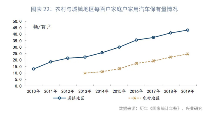 当前,城镇地区随着基数的提升,其汽车保有量的增速中枢较之前已有所回落,而农村地区仍有着较大的提升空间。2015-2019年间,城镇地区每百户家庭户的汽车拥有量年平均增速约为9.5%,而同期农村地区的平均增速则达到了16.7%。