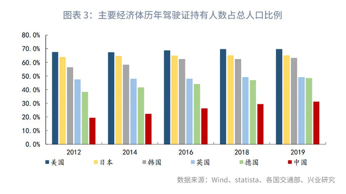 截至2019年末,我国驾驶证持有人数为4.35亿人,占全国总人口的比重约为31.1%。与其他发达国家相比,我国驾驶证持有人数的比例依然偏低。2019年同期,美国驾驶证持有人数占总人口的比重达到70.0%。美国居民出行高度依赖汽车,超过2/3的人口拥有驾驶证。而公共交通出行便利的日本,其持证人口占比也达到了65.1%。韩国这一数据则为63.1%。英国和德国相对略低但是也均超过了48.0%。从这一角度来看,当前我国居民汽车出行的比例依然较低,驾驶证持有比例仍有提升空间。