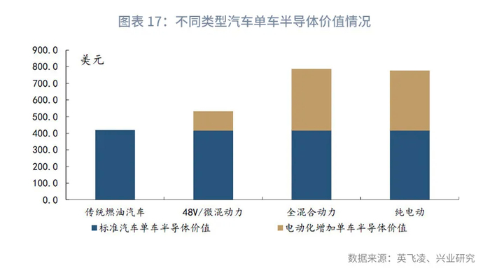 据MCU巨头英飞凌的测算,传统燃油汽车单车半导体价值约在417美元左右;而新能源汽车由于自身设计思路的不同,其单车半导体价值超出传统燃油汽车约360美元,约为780美元左右。
