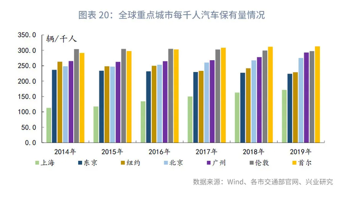 从每千人汽车保有量的情况来看,2019年上海每千人汽车保有量为170辆/千人,与全球其他重点城市还存在一定的差距,但北京、广州的每千人汽车保有量已经超过东京、纽约,仅次于伦敦、首尔。