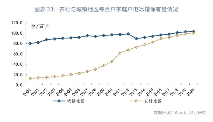 从家电下乡的经验来看,消费刺激政策对农村地区电器保有量的提升亦有着较为明显的作用。2008年11月28日,财政部、商务部、工信部联合下发了《关于全国推广家电下乡工作的通知》,宣布从2008年12月1日起,在14个省市开展家电下乡补贴工作;其他省市则自2009年2月1日开始实施;补贴产品包括彩电、冰箱、手机、洗衣机等。