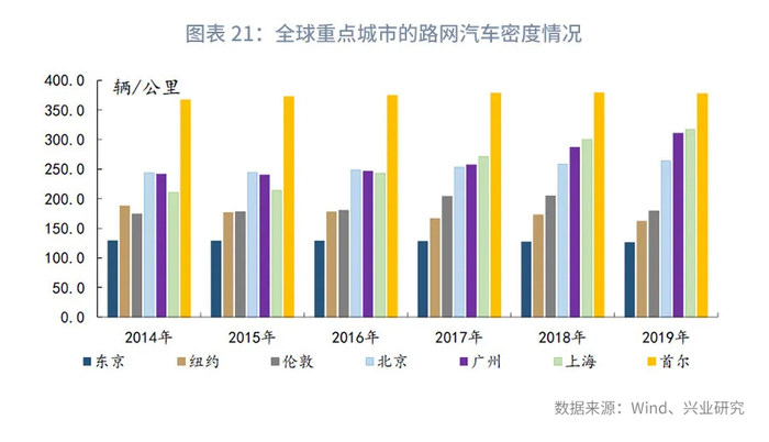 从全球重点城市的路网汽车密度情况来看,2019年北京(264)、广州(310)、上海(317)的路网汽车密度仅次于首尔(377),明显超过东京(126)、纽约(162)、伦敦(180)等地区。