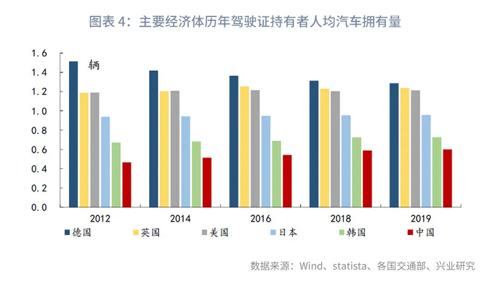 不仅是驾驶证的持有人数占比偏低,我国驾驶证持有者的人均汽车拥有量亦明显低于其他发达国家。2019年末,我国驾驶证持有者的人均汽车拥有量约为0.6辆,德国这一数据则达到1.29辆,英国和美国则分别为1.23辆和1.21辆。日韩与中国相似,由于人多地少、公共交通出行便利,其驾驶证持有者的人均汽车拥有量略低,但是亦达到了1.0辆和0.7辆。假设到了2025年,我国驾驶证持有者占比逐步提升至40%,且该部分人群的人均汽车拥有量达到0.68辆,则到2025年末我国汽车保有量有望达到3.83亿辆,年平均增长率约为6.4%,年平均增长2056万辆。