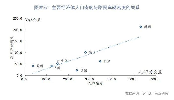 可以发现,人口密度越高的国家,由于土地要素的天然限制,其往往有着更高的路网汽车密度。从横向对比来看,我国当前路网车辆密度仍然处于相对合理的范围内,并且与英国、韩国等密度较高的国家相比仍有一定的距离。