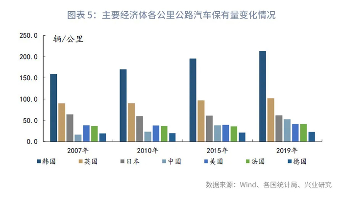2019年,我国道路网络的单公里汽车容纳量由2007年的16辆升至了52辆,增长了3.3倍。这或许是人们感觉交通拥堵不断加重的原因。横向比较来看,当前我国的道路网络的单公里汽车容纳量超过美国(41辆)、法国(41辆)、德国(22辆),但是仍低于日本(61辆)、英国(102辆)、韩国(213辆)。