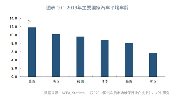 根据《2020中国汽车后市场维保行业白皮书》披露的数据,我国乘用车的平均车龄由2011年的3.8年上升至2019年的5.7年。但是与其他发达国家相比,乘用车的车龄相对偏低。2019年,英国的乘用车车龄约为8.0年,而美国的乘用车车龄更是达到11.8年。乘用车车龄的提升,意味着汽车维修保养市场会在一定程度上替代汽车存量更新市场。