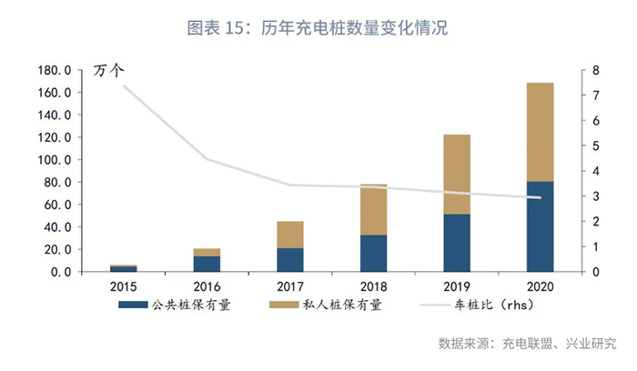 根据中国电动汽车充电基础设施促进联盟的统计数据,截至2020年末,我国充电基础设施总数约为168.1万台,车桩比约为2.92:1。国家电网电动汽车服务有限公司副总经理阙诗丰在2020全球未来出行大会上指出,充换电设施近些年发展迅猛,但车桩配比低于预期,2025年的发展目标是2:1的比例[3]。