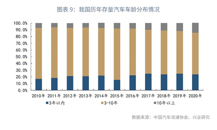 整体来看,近年来我国每年汽车存量更新的规模在500-600万辆左右,不过2020年受疫情影响,存量更新规模降至427万辆。我们用每年汽车存量更新规模除以前一年的汽车保有量,来观测每年汽车更新比例。可以发现,自2013年以来我国汽车存量更新的比例逐步下行,2019年占比约为2.5%,2020年受疫情影响,更新比例更是降至1.6%。其中,乘用车龄的延长无疑有着重要影响。中国汽车流通协会的数据显示,2010-2020年间,我国的3年以内车龄汽车占比由17.2%上升至23.9%,10年以上的车龄汽车占比则由6.8%上升至16.2%。新增汽车比例提升的同时,高龄汽车占比亦明显提升。