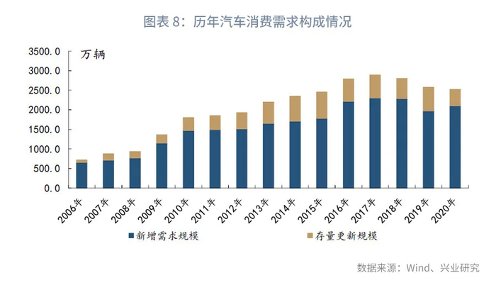 在增量市场之外,随着我国汽车保有量规模的持续扩大,汽车存量更新市场也在逐步提升,占当期汽车消费的比重亦有望稳步回升。我们可以用每年汽车销售的总量减去每年汽车保有量规模的增量,来衡量我国汽车存量更新的规模。