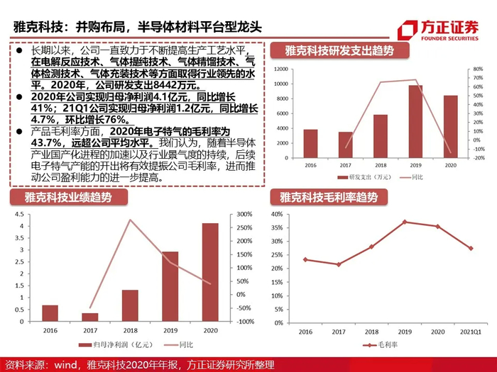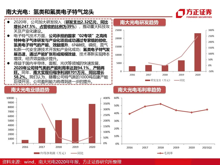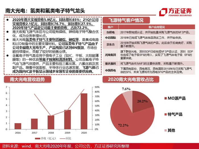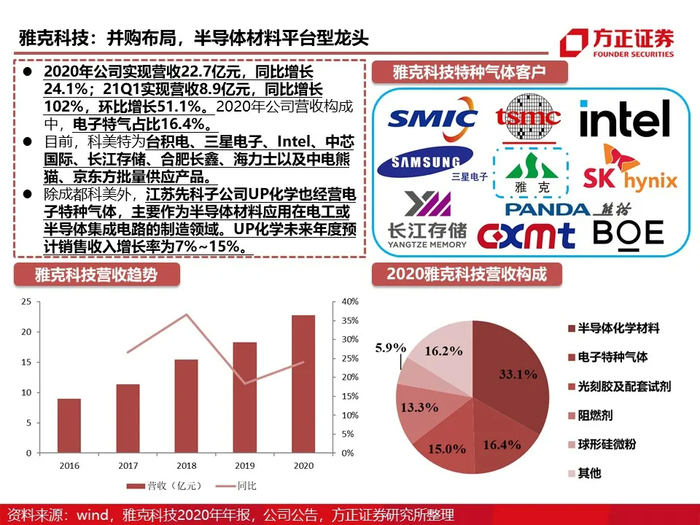 市场规模和结构:根据techcet,2020年全球电子气体市场规模约为58.5亿美元,其中电子特气的市场规模为41.9亿美元,占比71.6%。以海外龙头林德集团(含普莱克斯)、空气化工、液化空气和日本酸素为首的气体公司占有全球90%以上的电子特种气体市场份额。因半导体产业对气体质量、供应的特殊要求,中国半导体企业生产工艺中所使用的电子气体亦被海外龙头所垄断。随着未来疫情的缓解、能源革命与计算革命带动的半导体行业景气持续,预计2025年全球电子气体市场规模将超过80亿美元,年复合增速预计达到6.5%。