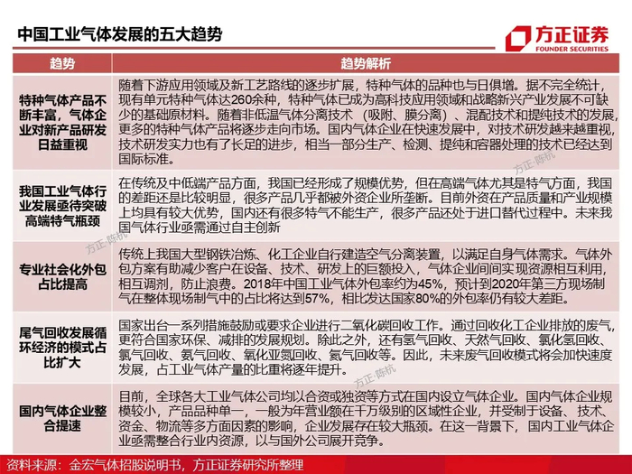 中国电子特气行业趋势:纵观工业气体百余年历史,气体纯度提升、品类增多、气体公司兼并收购贯穿其中。我们认为,国产特气未来的五大趋势分别为品类扩充、高端突破、专业分工明确、尾气回收扩大、气体企业整合提速。对于当前半导体上游供应链,国产替代已成为业界共识,当前电子气体国产化率不足15%,基于自主可控的供应链安全,随着下游Fab厂的加速认证,我们认为未来国产化率将显著提高。