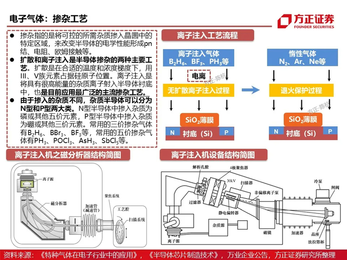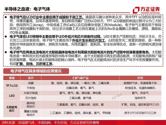 电子气体在电子产品制程工艺中广泛应用于离子注入、刻蚀、气相沉积、掺杂等工艺,被称为集成电路、液晶面板、LED 及光伏等材料的“粮食”和“源”。电子半导体器件的性能优劣与电子气体的质量息息相关。