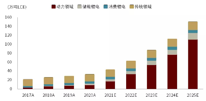 全球能源转型大势所趋,锂需求将迎百万吨级增量。在碳中和的大背景下,锂作为电池领域的关键材料,我们认为其动力领域以及储能领域锂电需求有望持续受益于清洁能源转型。其中,动力领域是锂需求最主要的增长点,我们预计全球新能源汽车销量将从2021年的524万辆增长至2025年的2146万辆, 2021-2025年CAGR为42%,对应动力领域锂需求将从2021年的18万吨LCE增长至2025年的117万吨LCE,2021-2025年CAGR高达59%。根据我们的测算,锂行业需求将从2021年的43万吨LCE增长至2025年的154万吨LCE, 2021-2025年CAGR为38%。