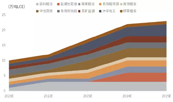 青海主要盐湖提锂工艺逐步稳定,已经具备大规模产能扩张的基础。经历长期的探索,青海主要盐湖的提锂工艺已经逐步稳定,且当地的基础设施也相对成熟,已经具备了大规模扩张的基础,而提锂技术的进步也有望激活部分盐湖资源,进一步扩大青海盐湖的供给阵营。我们预计青海盐湖的锂盐产能有望从2021年的10万吨增长至2025年的20-25万吨LCE,对应青海盐湖供给量从2021年的7万吨LCE增长至2025年的12-15万吨LCE。