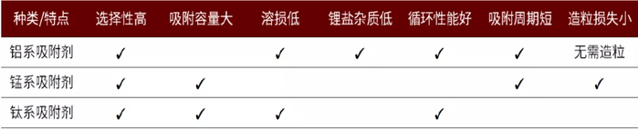 更高效的吸附剂和吸附工艺将是吸附法主要的研发方向。吸附法的核心是选用对锂离子选择吸附性好,并能够排除其他金属离子杂质的吸附剂。目前,吸附剂主要有铝系、锰系、钛系三种,其中仅铝系吸附剂实现了产业化生产,海外的FMC对于基于铝系吸附剂的吸附法已经有超过二十年的应用,铝系吸附剂具备选择性好、循环次数多的优点,但吸附容量相对较小,因此需建设大规模的吸附塔;锰系吸附剂和钛系吸附剂吸附量相对更大,但锰系吸附剂存在溶损严重、钛系吸附剂存在造粒较大的问题,当前仍在研发改进。我们认为未来吸附法的发展方向在于寻找更高效的吸附剂和吸附工艺,由于吸附剂的可设计性,未来仍有改善产品质量并降低生产成本的潜力。
