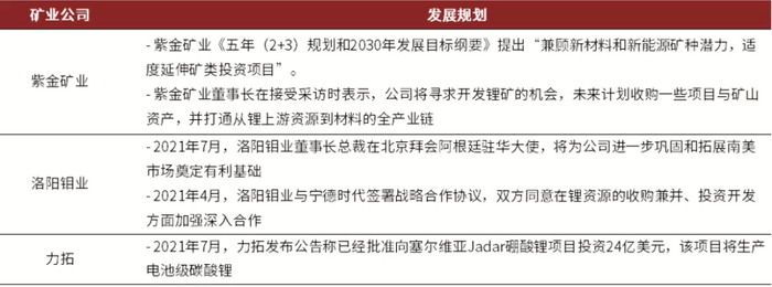 传统矿业龙头加快向锂行业扩张的进程。在新能源行业高速发展的背景下,传统矿业龙头逐步加快向锂行业扩张的进程。比如紫金矿业推出关于锂等新能源矿种的布局规划,未来业务布局适度向新能源、新材料延伸;洛阳钼业总裁拜访阿根廷大使,为公司进一步发展能源金属领域的矿业投资打下基础,而力拓等海外矿企也在推进锂资源的开发规划。