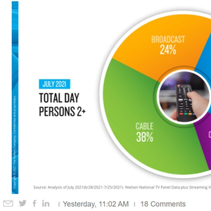 由于在很大程度上受到东京奥运会赛事安排的影响,无线电视的市场份额增至24%。流媒体的市场份额也上涨了一个百分点,达到28%,这同时也意味着有线电视的市场份额(38%)有所下降,但即便如此,有线电视的市场份额仍占领先地位。其他电视使用类别占据了10%的市场份额,比上月的9%有所上升。