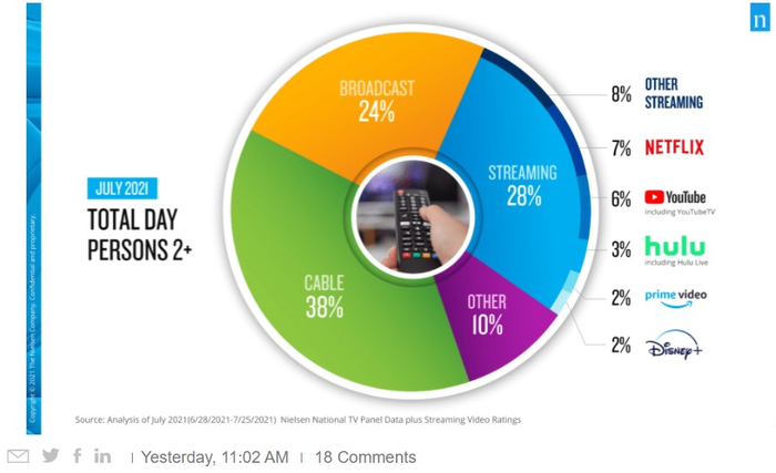 在流媒体28%的市场份额中,奈飞占市场份额的7%,谷歌旗下的YouTube占6%,Hulu占3%,及亚马逊旗下Amazon Prime Video和迪士尼旗下Disney+均占2%。“其他流媒体”服务占整体市场份额的8%。