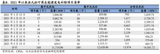 2021年九批可再生能源发电补贴项目,光伏风电合计近39GW。截至5月15日,2021年以来国家电网已公布九批可再生能源发电补贴项目清单,累计集中式风电项目168个,装机容量11.72GW,累计集中式光伏项目380个,装机容量12.62GW,累计分布式光伏项目13,974个,装机容量14.58GW。