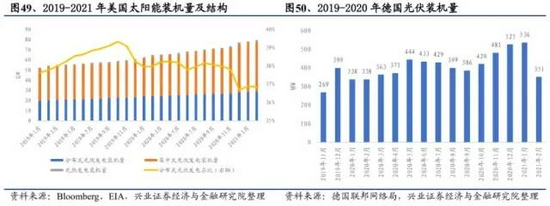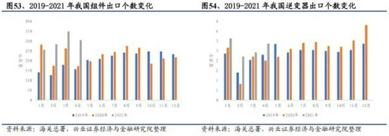 海外装机逐步开始复苏。美国1月份新增太阳能装机容量0.92GW,同比下降51.5%,环比下降76.9%;其中,新增集中式光伏装机容量0.42GW,去年同期为0.53GW;新增分布式光伏装机容量0.50GW,去年同期为1.37GW。2月份,新增太阳能装机容量1.13GW,同比增长60.1%,环比增长22.0%;其中,新增集中式光伏装机容量0.76GW,去年同期为0.41GW;新增分布式光伏装机容量0.37GW,去年同期为0.29GW。德国1月新增光伏装机容量0.54GW,去年同期为0.34GW,2月新增光伏装机容量0.35GW,去年同期为0.34GW,均有所增长。从海关总署关于我国组件和逆变器的出口金额、个数的数据中也可看出,2021年以来海外装机需求呈现“淡季不淡”的特征。