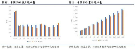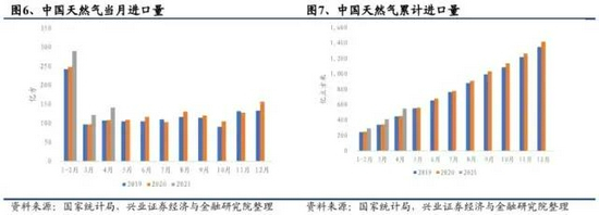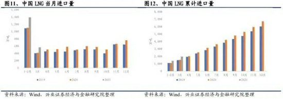 从以上数据可以看出,2021年1-4月燃气表观消费增速较去年有明显上升。燃气产量增速有所下滑,进口量增速上升明显。1-4月产量增速同比降低约2.4pct。而1-4月进口量增速上升了20.8pct,对外依存度在近几个月维持在43%-45%的水平。