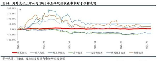 2021年初至今,部分光伏行业制造企业股价收益率不及恒指。年初至2021年06月08日,信义光能(00968.HK)、福莱特玻璃(06865.HK)、晶科能源(JKS.N)收益率分别为-36.2%、-36.8%、-40.1%,低于恒指同期的4.8%的收益率,大全新能源(DQ.N)、新特能源(01799.HK)分别取得正收益19.5%、26.8%,保利协鑫(03800.HK)目前处于停牌状态,从年初至停牌时的收益率为52.3%。