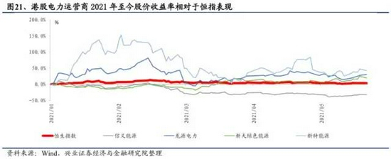 2021年初至今,新能源电力运营商股价收益率表现涨跌不一。年初至2021年6月8日,龙源电力、新天绿色能源分别取得26.8%,22.3%的收益率,超过恒指同期取得的4.8%的收益率。而信义能源年初以来股价下滑32.8%。