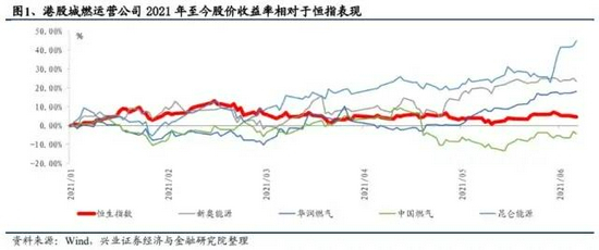 2021年初至今,港股城燃运营公司股价收益率表现较好。年初至2021年6月8日,除中国燃气股价下跌4.3%以外,昆仑能源、新奥能源和华润燃气分别取得45.0%,23.5%,18.3%的收益率,超过恒指同期取得的4.8%的收益率。