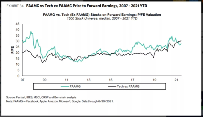 前几天,我看到一个估值对比图,说的是FAAMG从未像现在这样如此便宜。很多人听到会非常诧异,毕竟FAAMG五大巨头过去两年股价涨了这么多,苹果和微软的市盈率都翻倍了,估值竟然还变得更便宜了,这有点反常识。出现这种反常识的事实,主要是因为一些高估值板块涨的更加夸张。