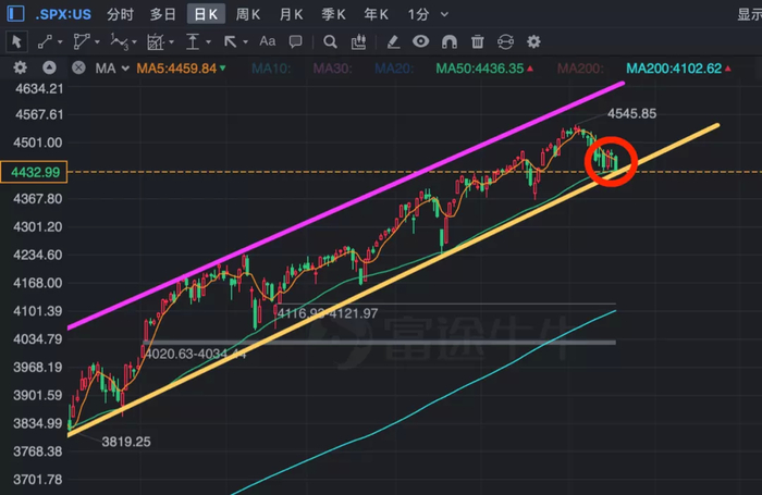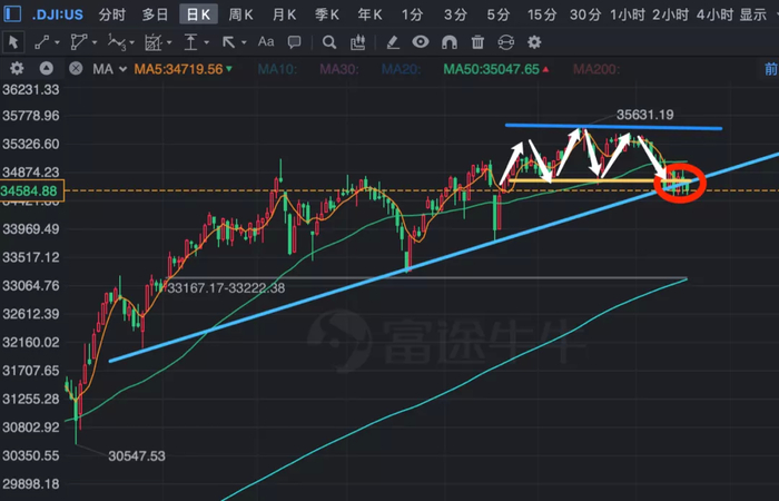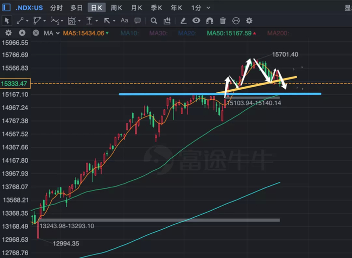 纳指虽然没有跌破重要支撑,但短线似乎也岌岌可危,如果你用空头的思维去看美股,现在已经形成了头肩顶,并且跌破了颈线支撑,短线股指往下的趋势已经确立。