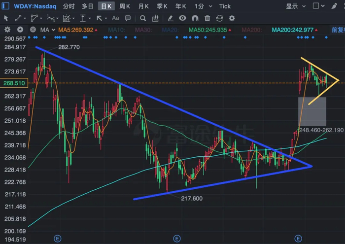 技术形态上,WDAY财报后跳空放量上涨,走出了一个明显的PEG,最近十几个交易日在高位走出了看涨的三角形整理形态,下周应该就是选择方向的时候。财报给出了这么好的指引,投资者日应该也没啥利空消息,算是一个明牌做多机会。