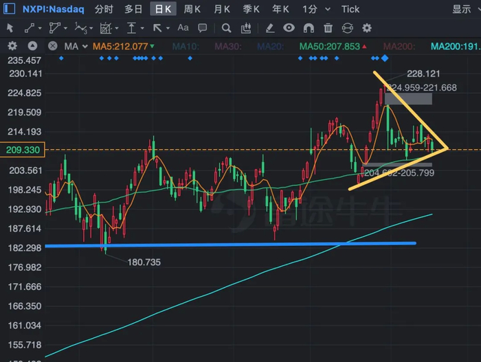 英特尔和英伟达如果周一下跌,那当天收盘应该是非常好的布局机会。恩智浦半导体的话需要稍微谨慎点,毕竟有跌破三角形整理的趋势,这公司主要是因为汽车芯片短缺,很多汽车停产了,有点影响业绩增长。