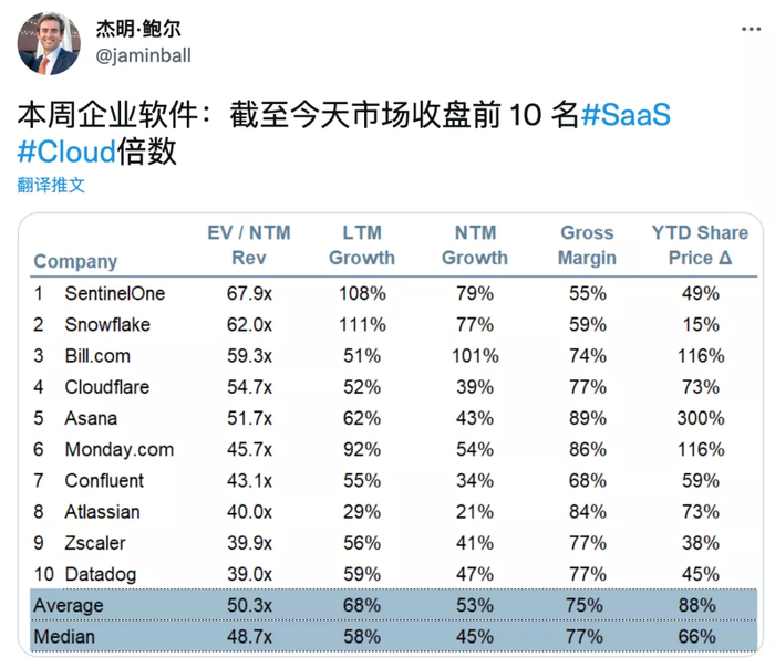 关键是某些SaaS成长股,那估值现在确实是有点看不懂了。今年美股涨幅最夸张的,其实就是SaaS板块,以前几年还能用40法则,用市销率(PS)去估值,好歹大家还能看得懂。不同增速的SaaS公司按不同的市销率去估值,年化营收*市销率,基本大概的估值范围就算出来了。