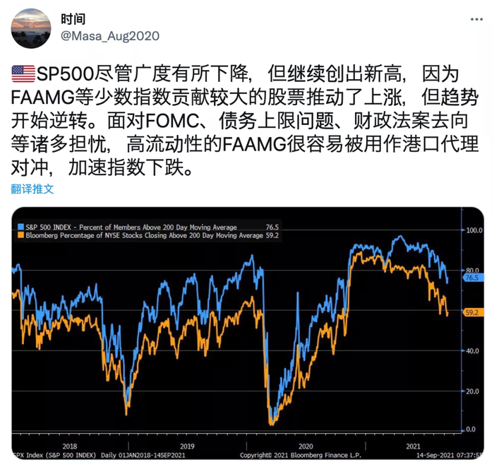 摩根士丹利首席美股策略师Mike Wilson进一步重申了标普500指数将出现10%回调的预测。“ 这可能只是开始。尽管该指数自3月份以来的修正从未超过4%,但自5月1日以来,该指数中56%的成份股回吐超过10%,表现不佳股票的弱势将在‘滚动修正’中拖累优质股票。经济周期中的转变总是以指数的修正结束。可能是一周,也可能是一个月后。”
