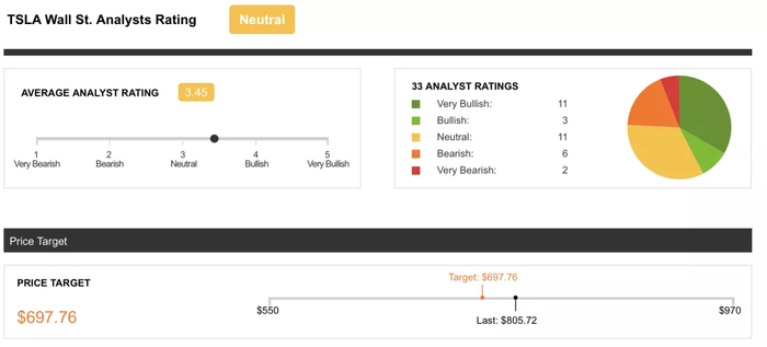 根据Seeking Alpha数据,目前共33位华尔街分析师对特斯拉给出评级,其中14人看多,8人看空。从历史平均目标价来看,华尔街给予特斯拉的目标价一直在不断攀升,近期达到了697.76美元的新高点。但即便如此,特斯拉实际表现仍远超华尔街预期,经历了大半年的回落与调整后,特斯拉股价又站上800美元。