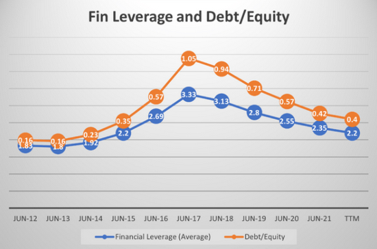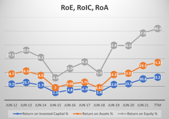 微软的净资产收益率(ROE)、资本回报率(ROIC)和资产收益率(ROA)这三个指标都很亮眼,其中ROE已在近些年急剧上升到接近50%,而与此同时财务杠杆却在稳步降低。