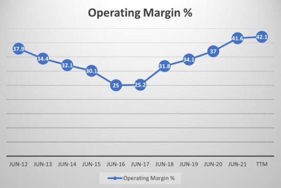 其营业利润率相当可观,目前约为40%,而且近些年一直稳步增长,2016-2017年的低谷主要是研发支出的增加导致。考虑到该企业大量的数据中心、周到的服务和产品支持、制造和分销中心、库存估值等都是成本的一部分,所以其长期保持在65%至70%之间的毛利率也是较高的。但从这些数据来看,作为一家成熟的科技巨头,微软的护城河不可谓不宽厚。一键投资美股科技巨头,点此马上出发>>