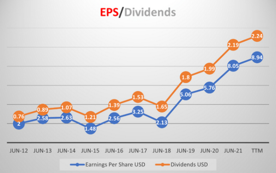 在过去的十年里,微软的每股收益、股息也取得了大幅增长。