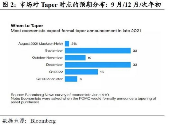 目前,根据彭博对Taper时点预期的调查,33%的经济学家认为在2020年9月,33%认为在2020年12月,22%认为在2022年初。