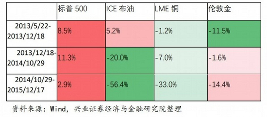 此外,数据显示,QE3 从TaperingTalk到最后美联储加息不同阶段内,各大类资产涨跌区别明显,美国股市由于基本面向好的缘故,整体上并未出现大幅回撤,只是短期内出现波动,相比较来看,油价、金价以及铜价受流动性影响严重,尤其是布伦特原油,在QE3完全退出至加息前这一时间段内下跌高达56%。