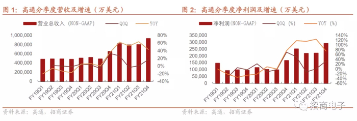 高通(QCOM)于11月4日发布FY21Q4(CQ3,2021年6月28日~9月26日)财报。FY21Q4营收93.2亿美元,同比+43.4%/环比+16.59%;净利润29.2亿美元,同比+74.7%/环比+32.5%。2021财年总收入334.7亿美元,同比+54.6%;净利润98.1亿美元,同比+103.7%;每股收益8.54美元,同比+103.8%。综合财报及交流会议信息,总结要点如下: