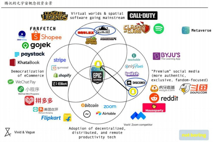 据智通财经了解,截至今年10月,腾讯直接或间接投资了67家游戏公司,其中就包括具有“元宇宙产品雏形”的Roblox和Epic。与此同时,在元宇宙必须的四方面技术能力——即平台入口、电子商务、区块链、社交媒体上,腾讯也均有所投资。