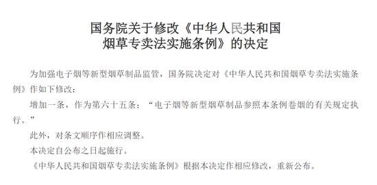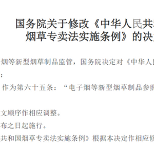 我国电子烟监管迎来重大进展。11月26日晚,国务院公布关于修改《中华人民共和国烟草专卖法实施条例》的决定,明确了电子烟等新型烟草制品的监管法律依据。