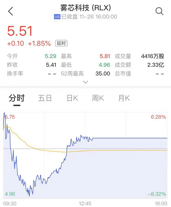 上述消息发布后,中概股雾芯科技(旗下悦刻品牌系中国第一电子烟品牌)盘前一度跌近20%,但开盘后涨超6%,随后又跌超8%,最后收涨1.85%,股价如坐“过山车”。