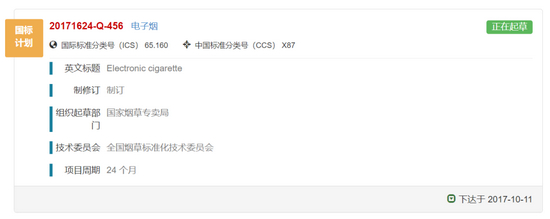 电子烟国标有重要进展。近期,全国标准信息服务公共平台上的“电子烟国标(20171624-Q-456)”状态已从“审查中”变更为“正在起草”。中国电子商会电子烟行业委员会呼吁,希望新的电子烟国家强制性标准能够早日出台并发布实施,有效规范电子烟生产经营活动,解决电子烟存在的产品质量安全风险等问题,切实保障消费者合法权益。