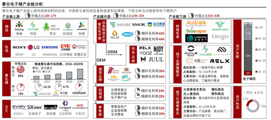 与欧美国家相比,我国电子烟产业仍处于初期发展阶段,但产业链已经成形。中国证券报·中证金牛座记者不完全统计,我国涉足电子烟概念的上市公司超过30家,但主要集中在原材料和零部件环节,包括烟油、电池、雾化器、芯片、烟具等。中游制造环节以OEM或ODM模式为主,其中思摩尔国际是全球最大电子雾化设备制造商。悦刻等品牌方群雄角逐。零售商是电子烟下沉非常重要的推手,包括天音控股、爱施德等。