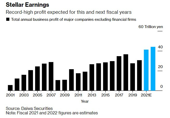 高盛策略师Kazunori Tatebe表示,“低估值和外国投资者的低敞口都将对日本股市有利。” 随着重新开放的步伐加快,Tatebe认为外国资金将“大量流入”。他估计,自疫情开始以来,外国资金已经卖出了多达7万亿日元(合613亿美元)的日本股票。