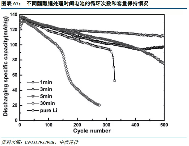 专利CN111293299B将锂金属用醋酸蒸汽处理,形成醋酸锂保护层。短时处理(1min)形成保护层对应的电池寿命最佳。